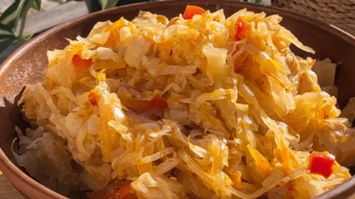 - Junte o tomate ou ajika, adicione a couve cortada em pedaços, sal e pimenta.