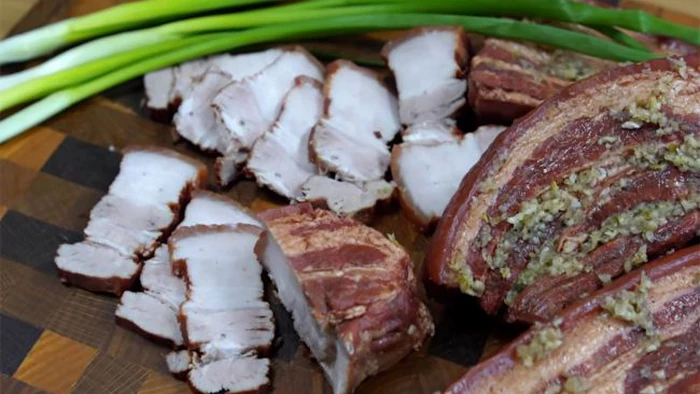 Cozinhar banha de porco em cascas de cebola produz um produto tenro com um sabor semelhante ao da banha fumada, mas sem a utilização de um fumeiro. O prato é fácil de fazer em casa e é perfeito para aperitivos ou sandes. A RBC-Ucrânia refere o canal do YouTube “Karpatski Shkvarki”.